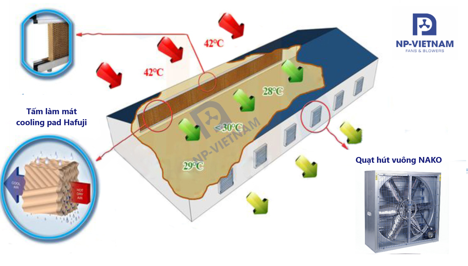 Với sự kết hợp giữa quạt hút công nghiệp và tấm làm mát hệ thống thông gió làm mát áp suất âm với cơ chế hoạt động một đầu hút và một đầu thổi của hệ thống giúp không gian nhà xưởng không những mát mẻ mà còn luôn khô thoáng, thanh lọc bụi bẩn, đảm bảo sức khỏe người dùng.