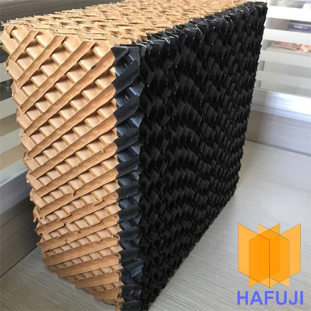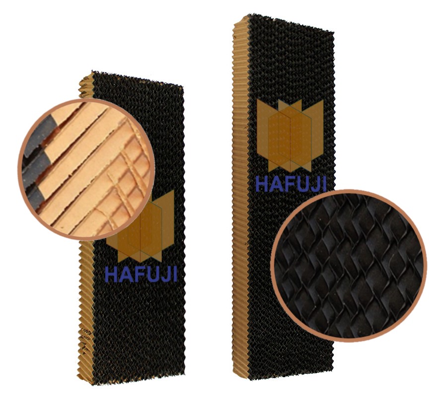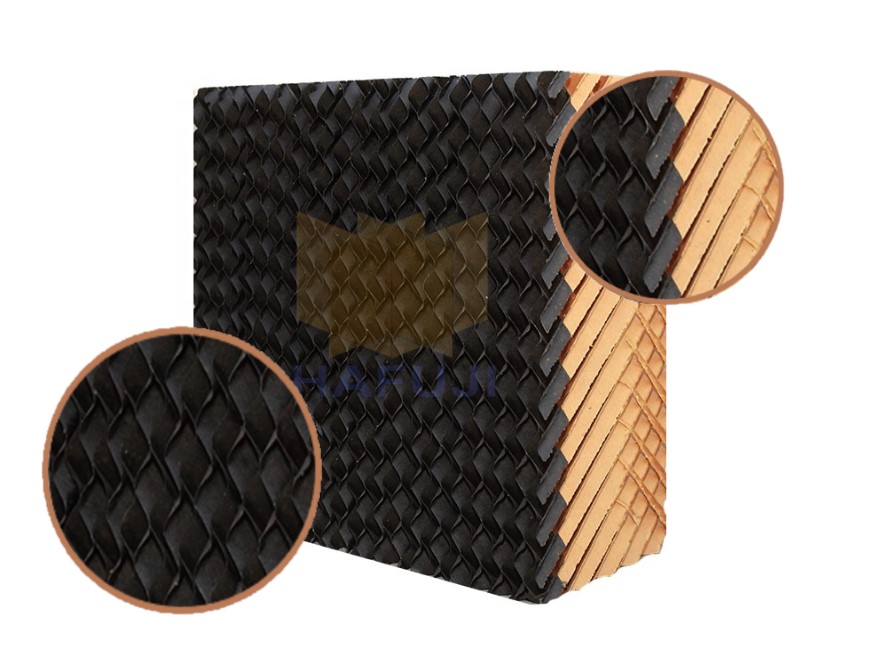 Tấm Cooling Pad 1800x600x150 chống rêu: hay tấm làm mát màu đen là “Tấm” giấy được tạo ra từ các tấm giấy Kraft sau khi trải qua các công đoạn nhúng keo, tạo sóng, xếp chồng lên nhau và ép thành các “khối tường giấy”. Tấm Cooling Pad có kết cấu vững chắc (không mục nát trong môi trường ẩm ướt), khả năng giữ ẩm cùng các lỗ thông khí được bố trí đều trên mặt tấm tạo với nhau thành góc 450. Nguồn không khí nóng sau khi đi qua Cooling pad đảm bảo sẽ được giảm nhiệt đáng kể.