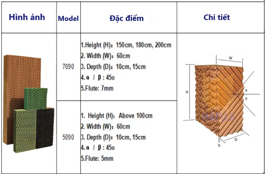 Tấm làm mát cooling pad 7090 là mẫu tấm làm mát được nhiều khách hàng của Hafuji lựa chọn để lắp đặt cho hệ thống làm mát nhà xưởng trong công nghiệp như: Dệt may, da giày, bao bì, dược phẩm, điện tử..., các trang trại chăn nuôi gia súc gia cầm, nhà màng trồng hoa cây cảnh. Dòng sản phẩm này có thông số cơ bản như sau:
