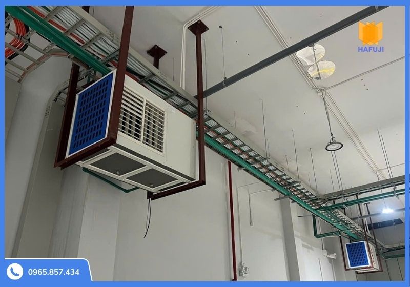 Dàn lạnh được thiết kế với 4 hướng thổi mạnh, giúp luồng gió lan tỏa rộng và làm mát đồng đều trong mọi khu vực của nhà xưởng. Lưu lượng gió lớn nhưng vận hành vẫn êm ái nhờ động cơ được tối ưu giảm rung, giảm tiếng ồn. Vỏ dàn lạnh dày, chắc chắn cùng lưới lọc bụi dễ tháo lắp giúp thiết bị hoạt động ổn định trong môi trường có nhiều bụi mịn và tác động cơ học.