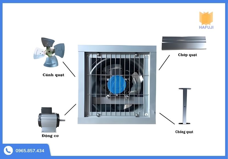 Quạt hút gắn tường 400x400 được cấu tạo từ các bộ phận chính gồm khung quạt, cánh quạt, động cơ motor và lưới bảo vệ. Sự kết hợp đồng bộ giữa các chi tiết này giúp quạt vận hành ổn định, đáp ứng nhu cầu thông gió cơ bản trong những không gian có diện tích nhỏ và trần thấp. Việc hiểu rõ cấu tạo cũng giúp người dùng lựa chọn và sử dụng quạt hiệu quả hơn trong thực tế.