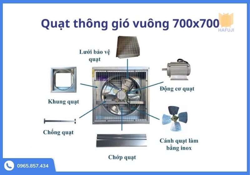 Quạt hút công nghiệp vuông 700x700 được cấu tạo từ nhiều bộ phận chính, mỗi bộ phận đảm nhiệm một vai trò riêng nhằm đảm bảo khả năng thông gió ổn định và vận hành bền bỉ trong môi trường công nghiệp.