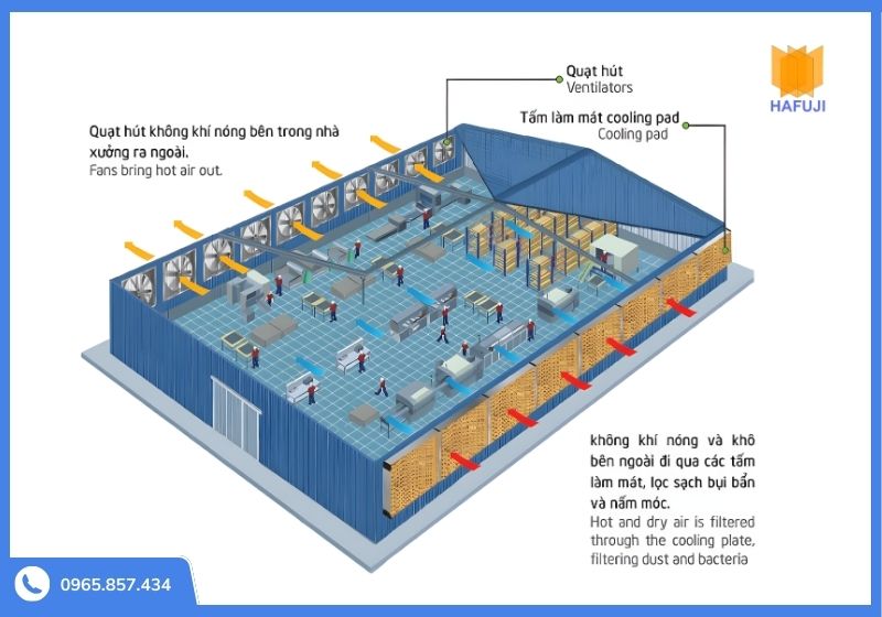 Nguyên lý hoạt động của quạt tương tự các hệ thống thông gió nhà xưởng phổ biến, dựa trên cơ chế tạo áp suất âm để hút khí nóng ra ngoài.
