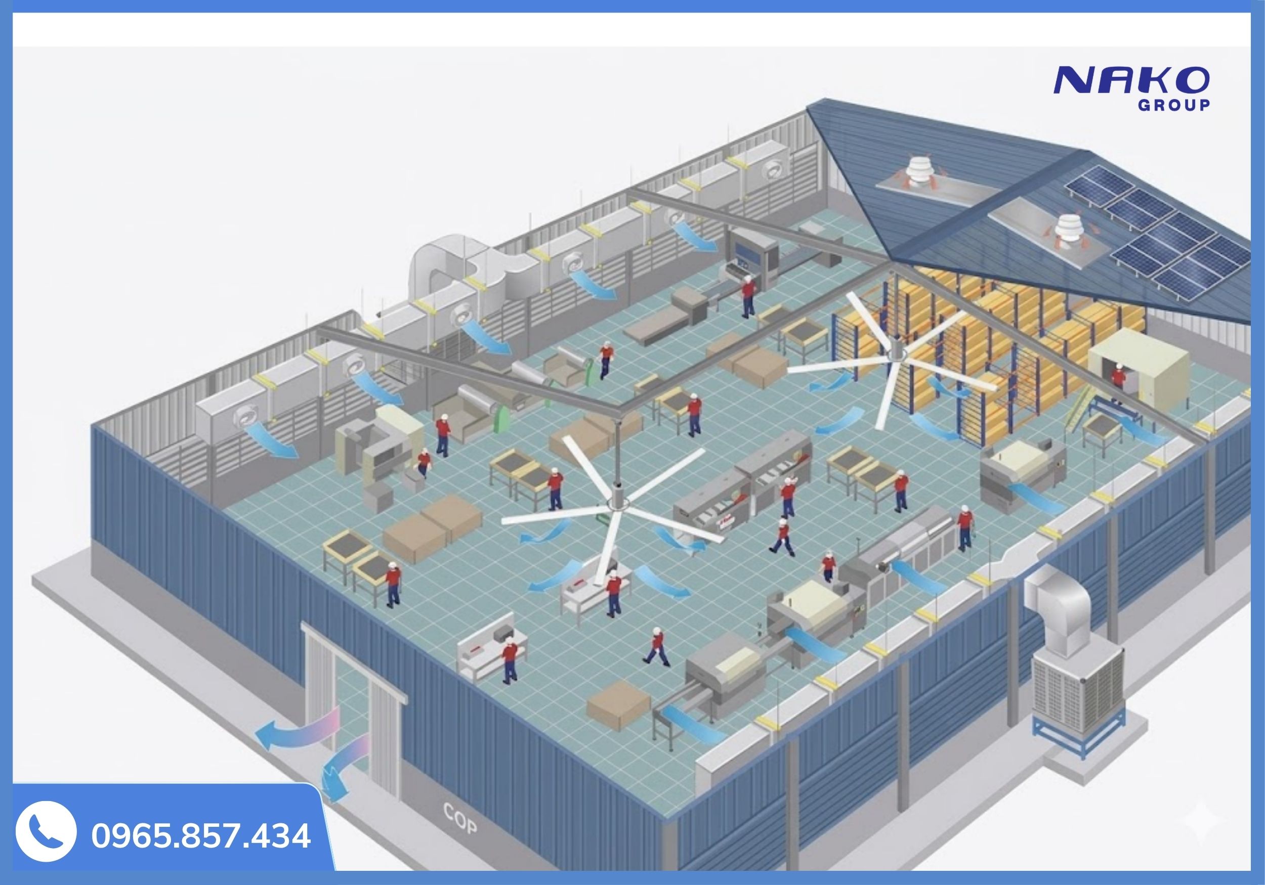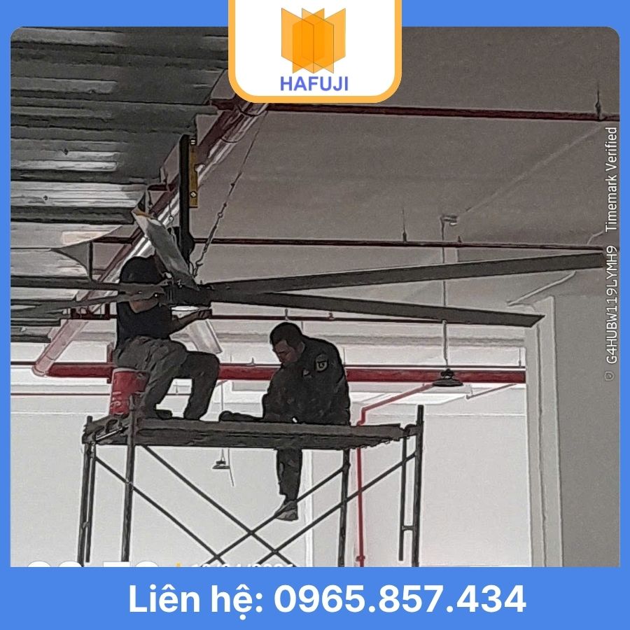 Trả lời: Chi phí phụ thuộc vào cấu trúc trần, số lượng quạt và yêu cầu điều khiển thông minh (IoT). Quý khách vui lòng gọi 0965.857.434 để nhận báo giá chi tiết theo diện tích nhà xưởng.