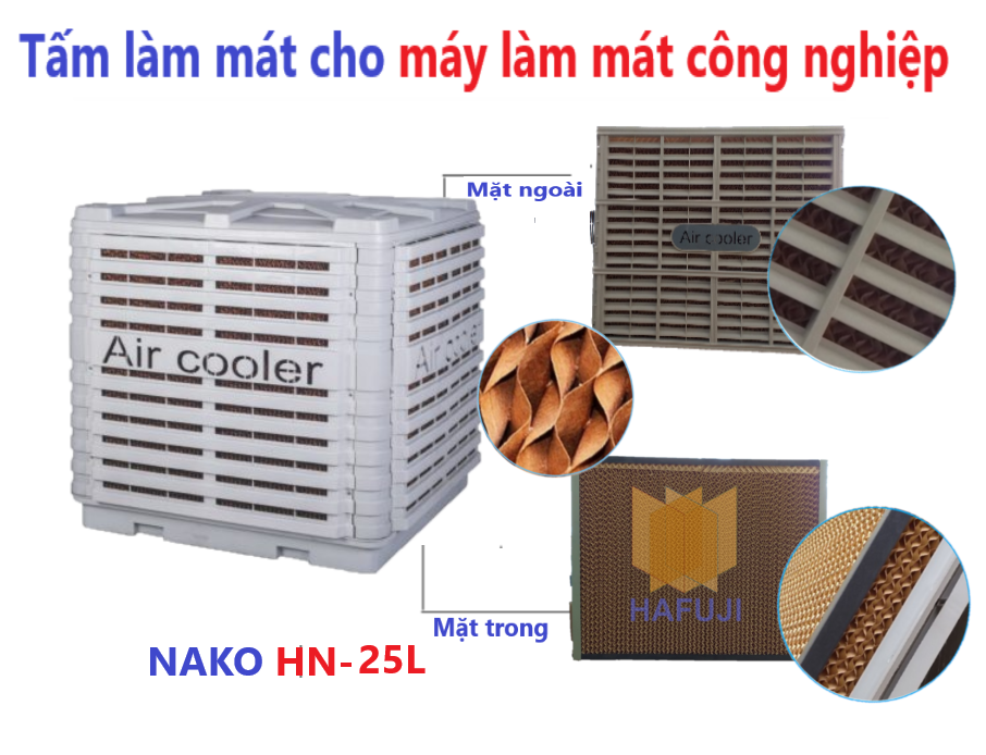 Máy làm mát công nghiệp Nako 25.000 có tất cả 3 (hoặc 4) tấm làm mát (như hình ảnh) được gắn liền với khung của máy làm mát. Đối với máy làm mát thổi lên hoặc thổi xuống, 4 tấm làm mát sẽ được gắn xung quanh thân máy. Đối với máy thổi ngang, tấm sẽ được lắp ở 3 khung cạnh còn lại của máy. Với nguyên lý trao đổi nhiệt, khí nóng từ ngoài được hút vào bên trong máy làm mát, đi qua tấm làm mát đã được làm ướt sẽ giúp nhiệt độ qua cửa gió thổi vào nhà xưởng là không khí mát. Ngoài ra tấm làm mát 5090 còn có khả năng lọc bụi và chống rêu rất hiệu quả.