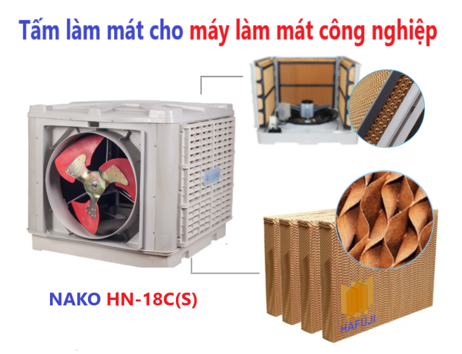 Máy làm mát công nghiệp Nako 18.000 có tất cả 3 (hoặc 4) tấm làm mát (như hình ảnh) được gắn liền với khung của máy làm mát. Đối với máy làm mát thổi lên hoặc thổi xuống, 4 tấm làm mát sẽ được gắn xung quanh thân máy. Đối với máy thổi ngang, tấm sẽ được lắp ở 3 khung cạnh còn lại của máy. Với nguyên lý trao đổi nhiệt, khí nóng từ ngoài được hút vào bên trong máy làm mát, đi qua tấm làm mát đã được làm ướt sẽ giúp nhiệt độ qua cửa gió thổi vào nhà xưởng là không khí mát. Ngoài ra tấm làm mát 5090 còn có khả năng lọc bụi và chống rêu rất hiệu quả.