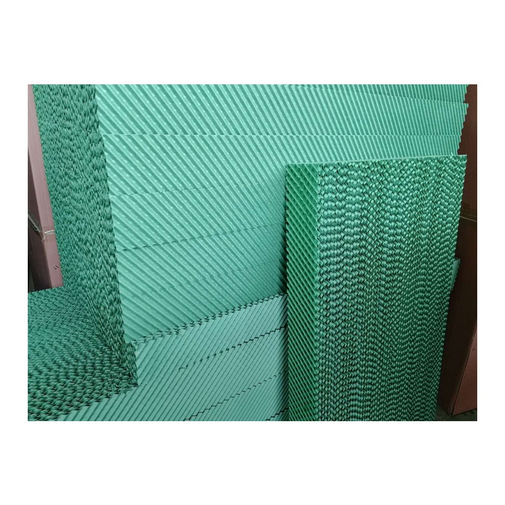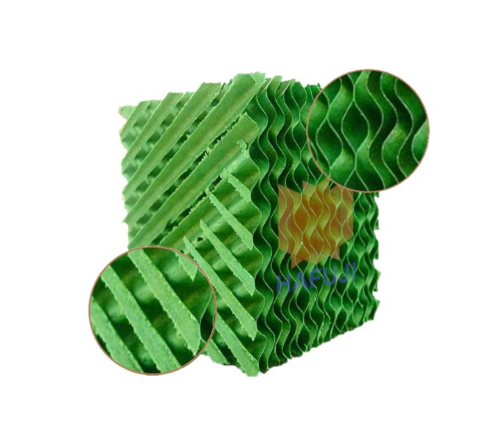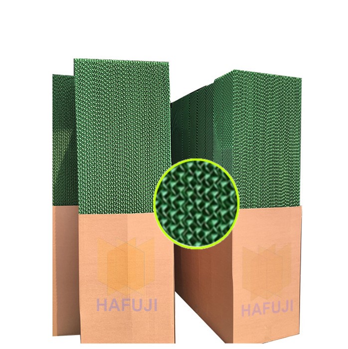 1. Cooling Pad xanh: hay tấm làm mát màu xanh là “Tấm” giấy được tạo ra từ các tấm giấy Kraft sau khi trải qua các công đoạn nhúng keo, tạo sóng, xếp chồng lên nhau và ép thành các “khối tường giấy”. Cooling Pad có kết cấu vững chắc (không mục nát trong môi trường ẩm ướt), khả năng giữ ẩm cùng các lỗ thông khí được bố trí đều trên mặt tấm tạo với nhau thành góc 450.